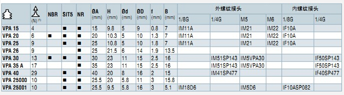 詳細(xì)信息 VPA15,VPA20,VPA25,VPA26,VPA30,VPA35A,VPA40,VPA25000,VPA25001,COVAL紙張吸盤(pán) VPA系列紙張吸盤(pán),Ø15 - 25.5mm,材料:丁腈橡膠(NBR),半透明硅膠(SIT),天然橡膠(NR)。 主要參數(shù)見(jiàn)下表: