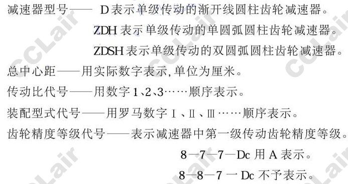 在減速器的代號(hào)中,包括減速器的型號(hào),總中心距,傳動(dòng)比,裝配型式及齒輪精度等級(jí).