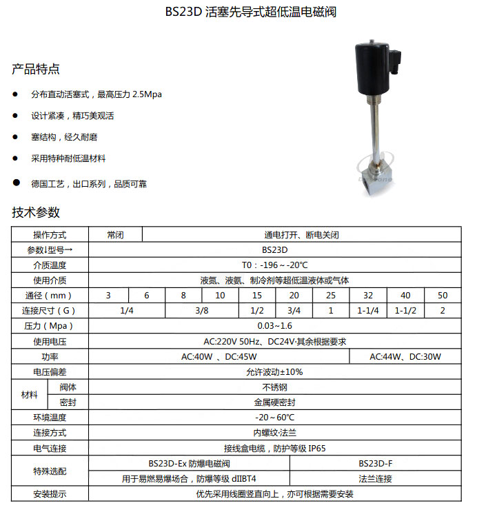 詳細(xì)信息 BS23D-DN3,BS23D-DN6,BS23D-DN8,BS23D-DN10,活塞先導(dǎo)式超低溫電磁閥