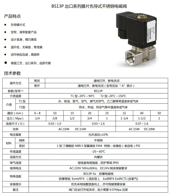詳細(xì)信息 BS13P-DN6,BS13P-DN8,BS13P-DN10,BS13P-DN15,BS13P-DN20,膜片先導(dǎo)式不銹鋼電磁閥