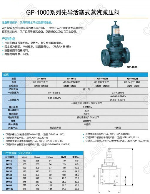 詳細信息 GP-1000,GP-1010,GP-1000H,GP-1010H,GP-1010H-DN50,先導(dǎo)活塞式蒸汽減壓閥