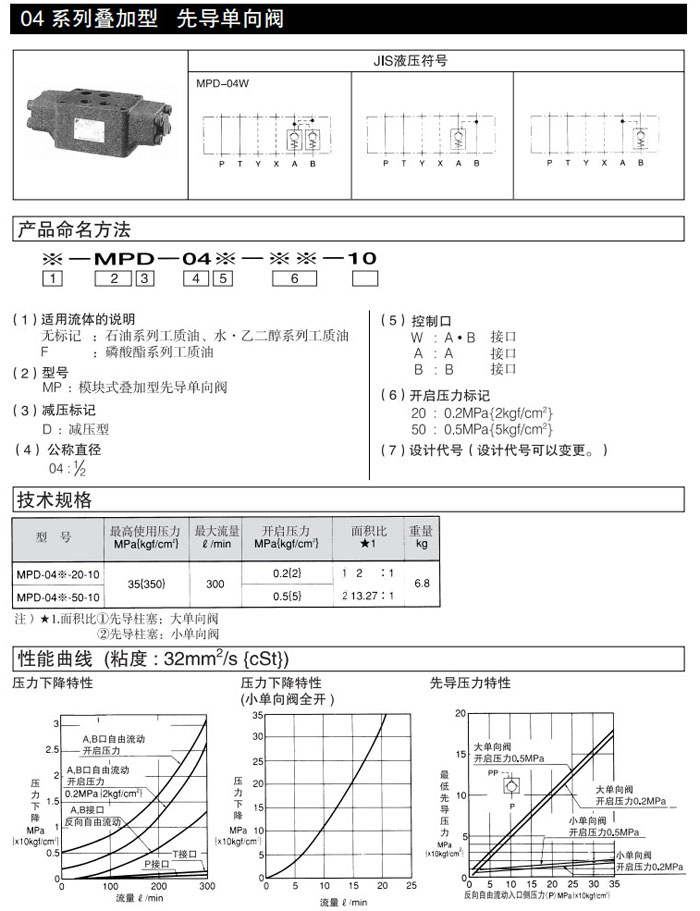 MPD-04W-20-10,MPD-04W-50-10,MPD-04A-20-10,MPD-04A-50-10,MPD-04B-20-10,MPD-04B-50-10,DAIKIN疊加型先導(dǎo)單向閥