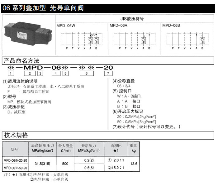 MPD-06W-20-20,MPD-06A-20-20,MPD-06B-20-20,MPD-06W-50-20,MPD-06A-50-20,MPD-06B-50-20,DAIKIN疊加型先導(dǎo)單向閥