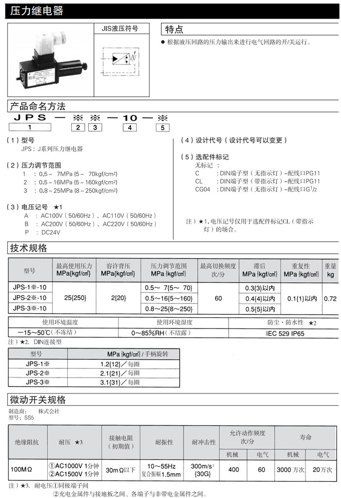 詳細信息 JPS-1A-10,JPS-1B-10,JPS-1P-10,JPS-2A-10,JPS-2B-10,JPS-2P-10,JPS-3A-10,JPS-3B-10,JPS-3P-10,DAIKIN壓力繼電器