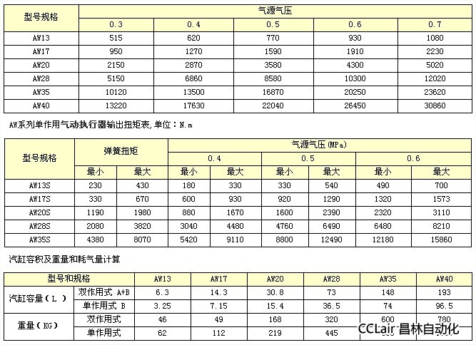 AW系列雙作用氣動(dòng)執(zhí)行器輸出扭矩表,單位:N.m