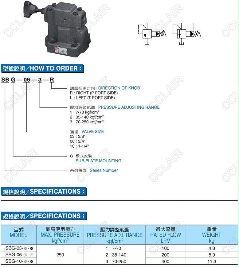 SBG-03-1-R,SBG-03-1-L,SBG-06-2-R,SBG-06-2-L,SBG-10-3-L,低噪音引導(dǎo)式溢流閥CML