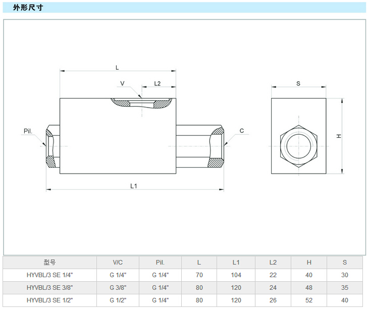 HYVBL/3 SE 1/4",HYVBL/3 SE 3/8",HYVBL/3 SE 1/2",單先導式單向閥