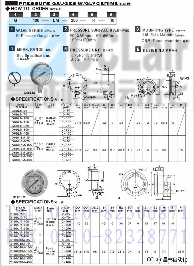 詳細信息 G100LM-350,G100LM-400,G100CBM-350,G100CBM-400,甘油式壓計
