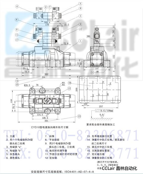 CYD系列電液換向閥有10通徑、16通徑、25通徑和32通徑尺寸規(guī)格,安裝底板符合ISO4401標(biāo)準(zhǔn)。