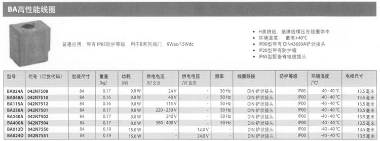 詳細信息 BA024A,BA048A,BA115A,BA230A,BA240A,BA400A,BA012D,BA024D,電磁閥線圈