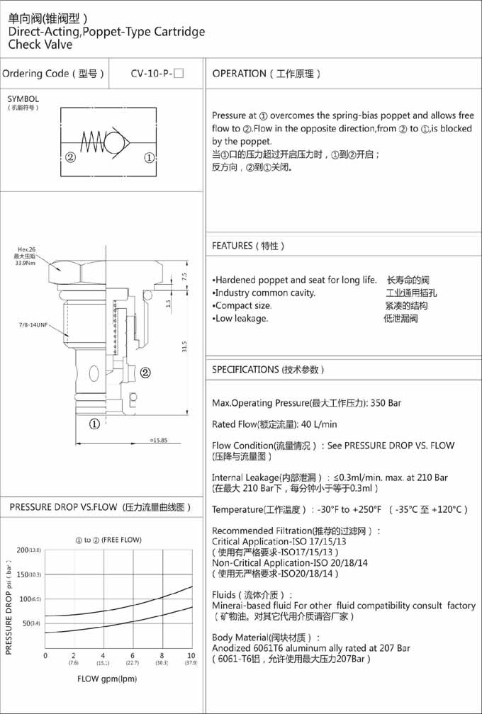 詳細(xì)信息 CV-10-P-10,CV-10-P-21,CV-10-P-28,CV-10-P-48,單向閥