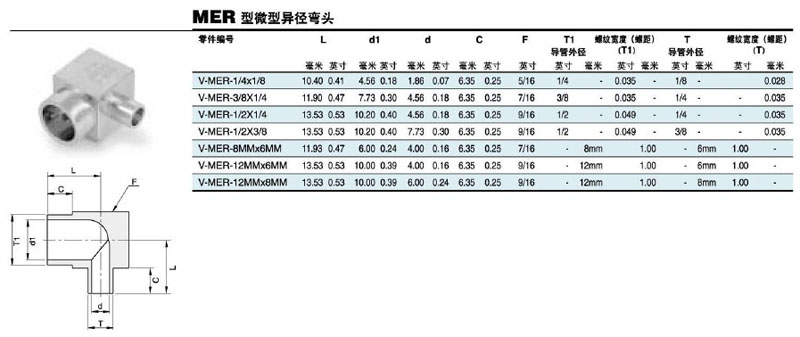 詳細(xì)信息 V-MER-1/4*1/8,V-MER-3/8*1/4,V-MER-8MM*6MM,V-MER-12MM*6MM,微型異徑彎頭