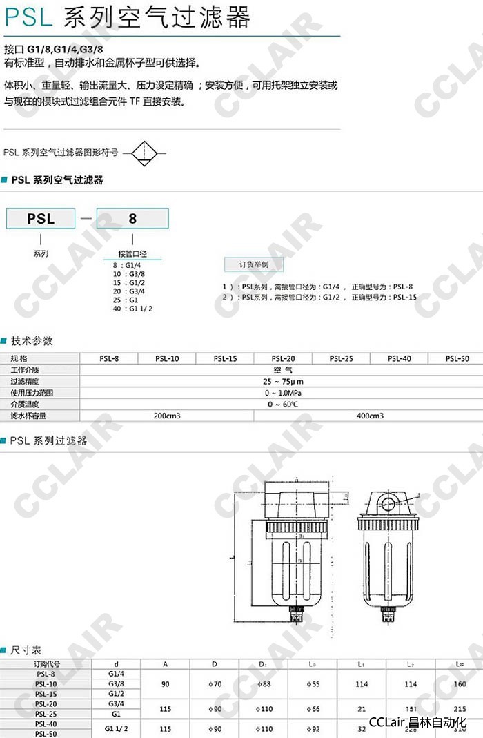 詳細信息 PSL40-MS,PSL40-01,PSL40-02,PSL40-03,PSL40-04,PSL40-06,PSL40-10,氣動過濾器