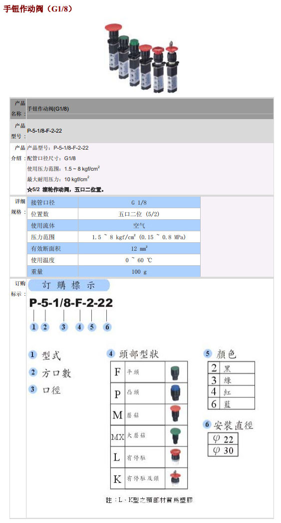 詳細(xì)信息 P-5-1/8-F-2-22,POSU手鈕作動閥
