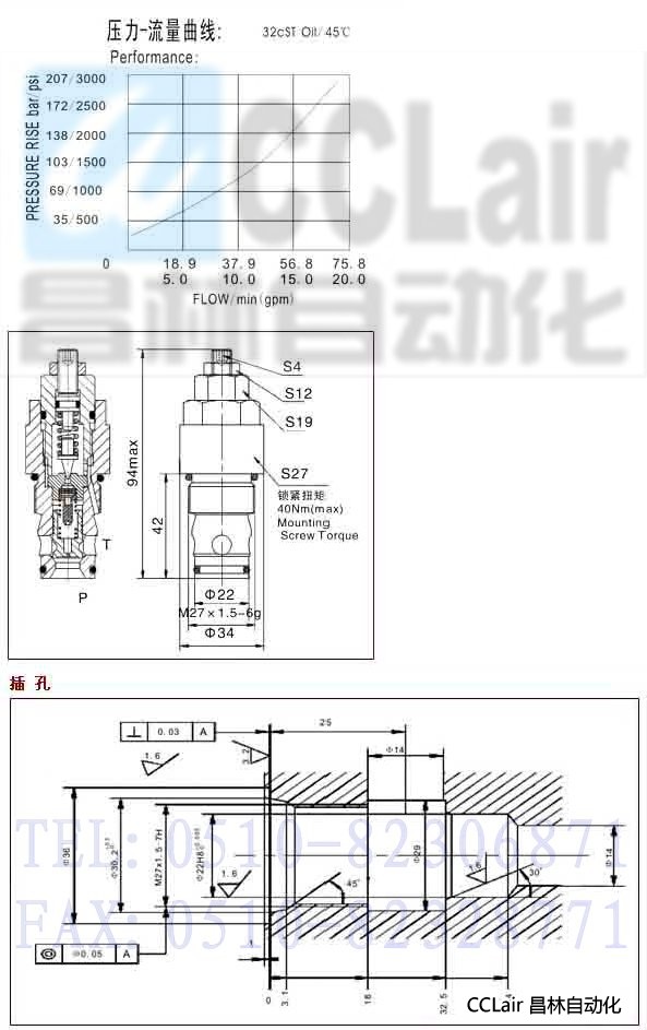 閥體P口和T口不通,直到P口壓力超過設(shè)定壓力且打開先導(dǎo)閥芯。先導(dǎo)閥芯引起主閥芯兩端壓力差的變化,壓力差達(dá)到一定時(shí),P口和T口通。