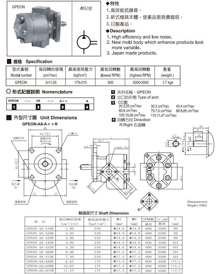 GPEON-A8-A10R,GPEON-A8-A20R,GPEON-A8-A30R,GPEON-A8-A40R,taicin齒輪幫浦