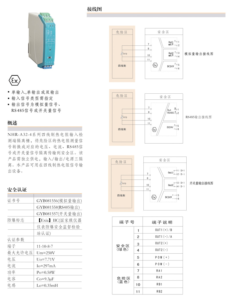 NHR-A32-4四線制熱電阻輸入檢測端隔離柵,將危險區(qū)的熱電阻測量信號轉換成對應的電壓、電流、RS485信號或開關量信號隔離傳輸到安全區(qū)。該產品需獨立供電,輸入/輸出/電源三隔離。本產品可用在四線制熱電阻信號輸出設備。