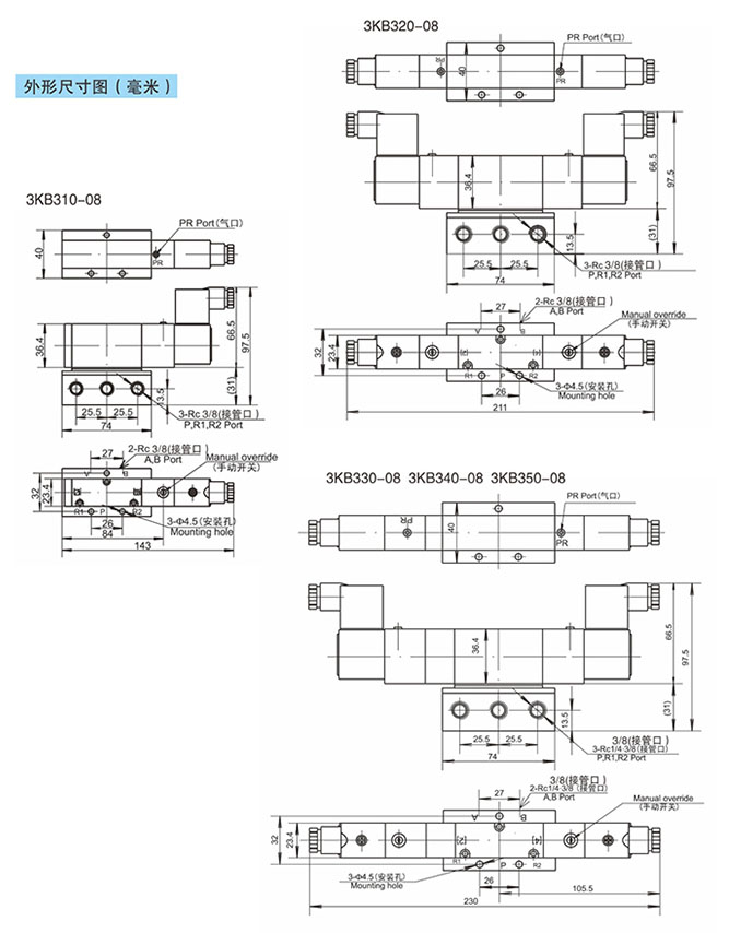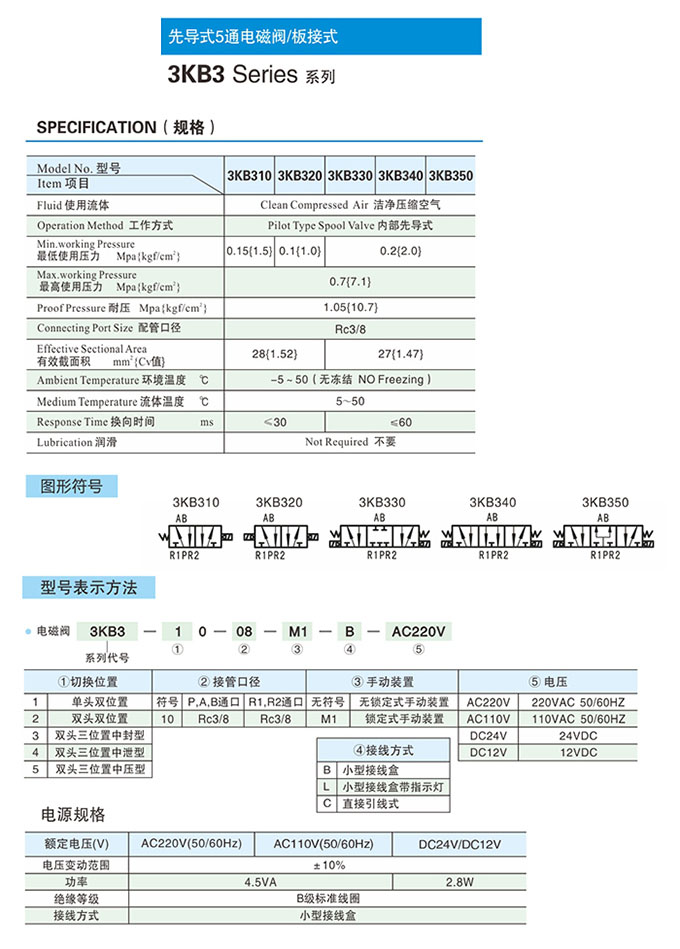 3KB310-08,3KB320-08,3KB330-08,3KB340-08,3KB350-08,3KB310-08-B,先導式五通電磁閥