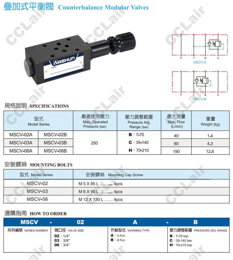 MSCV-02A,MSCV-02B,MSCV-03A,MSCV-03B,MSCV-06A,MSCV-06B,MSCV-06B-H,ASHUN油順疊加式平衡閥