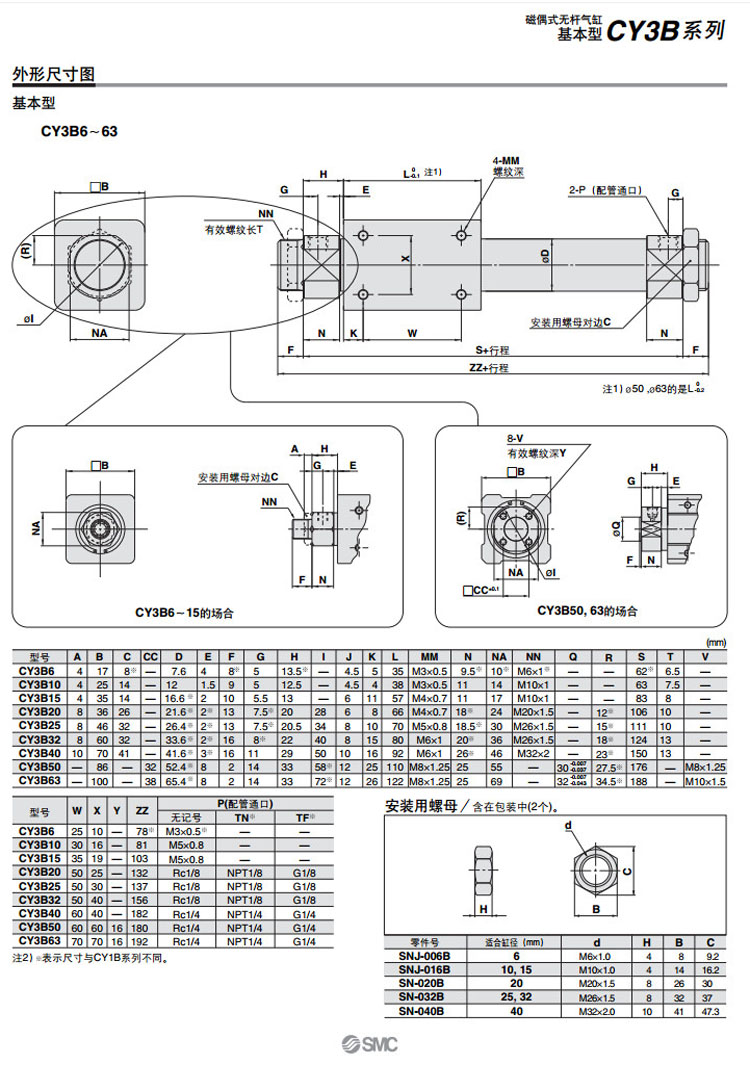 CY3B6,CY3B10,CY3B15,CY3B20,CY3B25,CY3B32,CY3B40,CY3B50,CY3B63,CY3B6-50,SMC磁偶式無桿氣缸