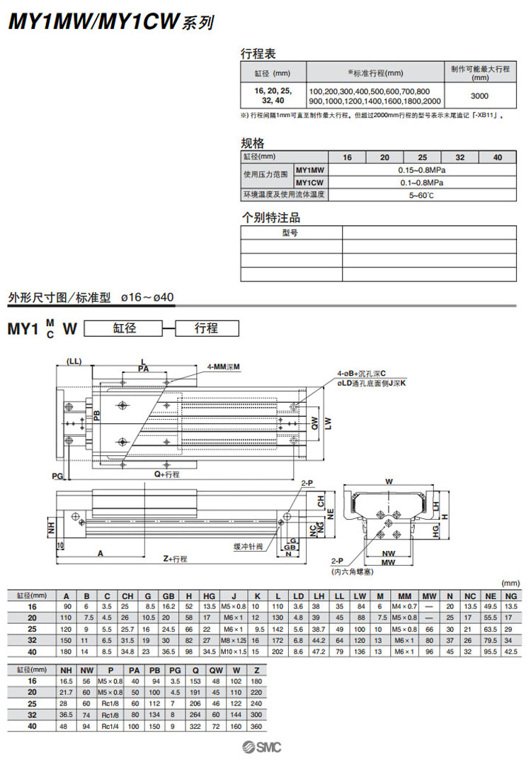 MY1MW16,MY1MW20,MY1MW25,MY1MW32,MY1MW40,MY1CW16,MY1CW20,MY1CW25,MY1CW32,MY1CW40,MY1MW16-100,SMC無桿氣缸