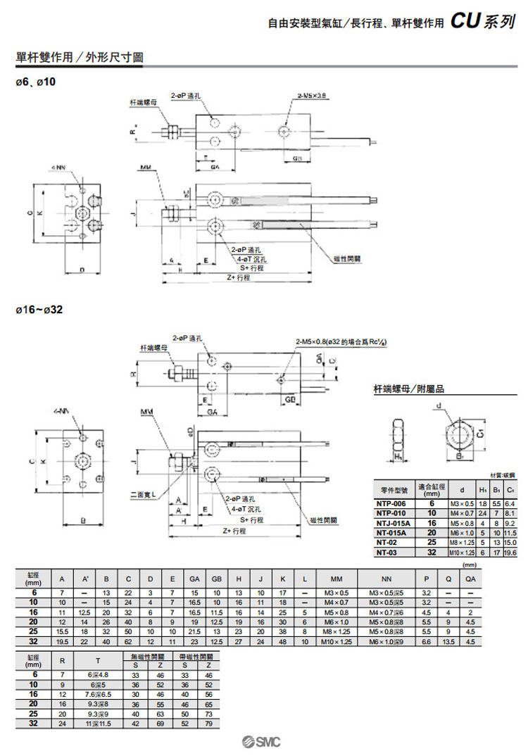 CU6,CU10,CU16,CU20,CU25,CU32,CDU6,CDU10,CDU16,CDU20,CDU25,CDU32,CU6-40D,SMC自由安裝型氣缸