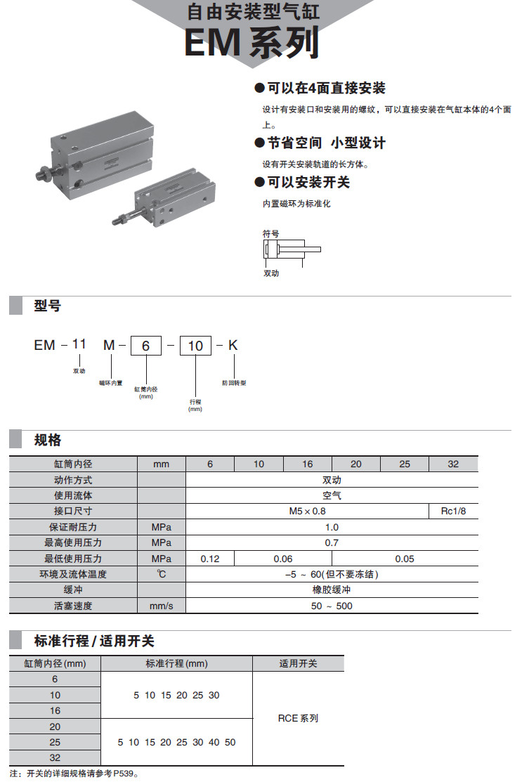 EM-11M-6,EM-11M-10,EM-11M-16,EM-11M-20,EM-11M-25,EM-11M-32,自由安裝型氣缸