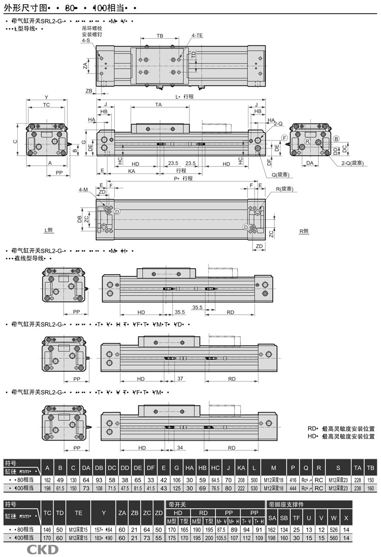 SRL2-GQ-LB1-25B-200,SRL2-GQ-LB1-25B-300,SRL2-GQ-LB1-25B-400,SRL2-GQ-LB1-25B-500,CKD超級(jí)無活塞桿型氣缸