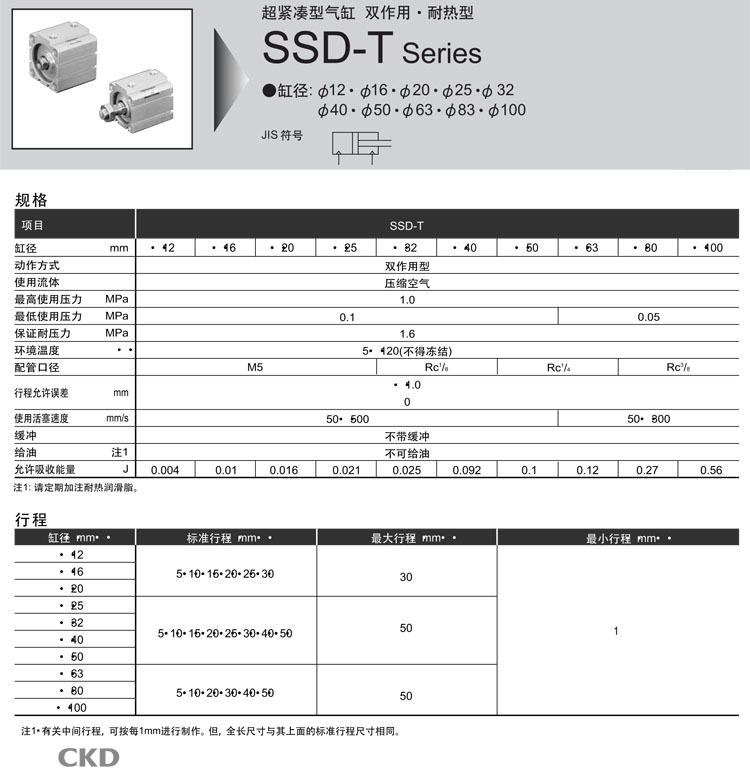 SSD-T-12,SSD-T-16,SSD-T-20,SSD-T-25,SSD-T-32,SSD-T-40,SSD-T-50,SSD-T-63,SSD-T-80,SSD-T-100,CKD超緊湊型氣缸