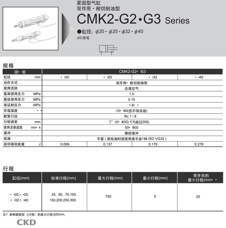 CMK2-G3-FB-40-150,CMK2-G3-FB-40-200,CMK2-G3-FB-40-250,CMK2-G3-FB-40-300,CMK2-G3-CA-40-25,CMK2-G3-CA-40-50,CKD緊固型氣缸