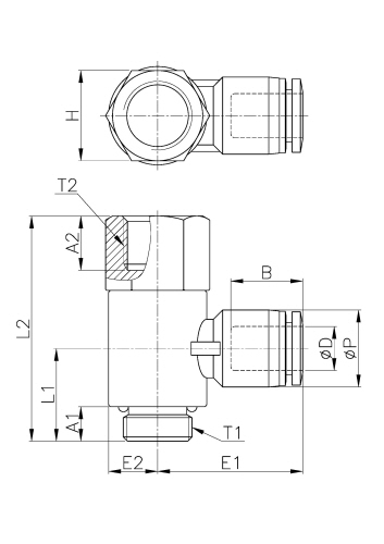 | Model | ∅D | ∅P | T1 | T2 | L1 | L2 | E1 | E2 | A1 | A2 | B | H(Hex) | ORIFICE | WEIGHT(g) | EA(BOX) |