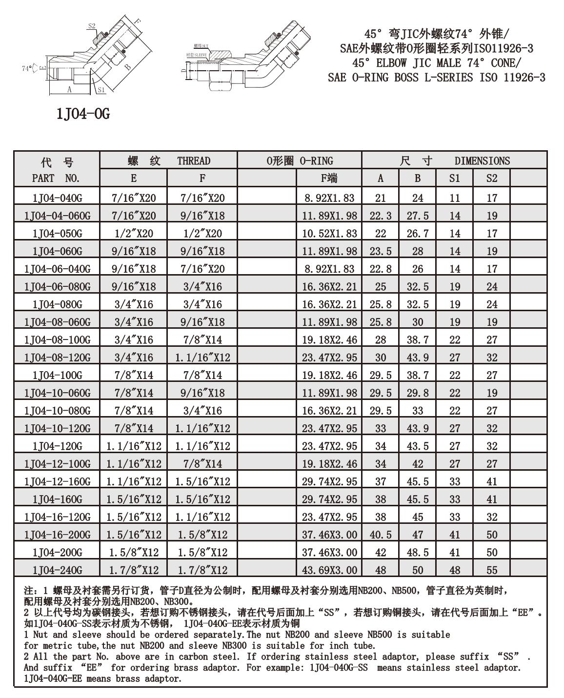 1J04-040G,1J04-060G,1J04-080G,1J04-100G,1J04-120G,1J04-160G,1J04-200G,1J04-240G,美制螺紋74°錐面接頭