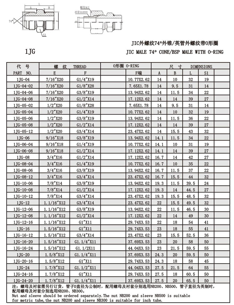 1JG-04,1JG-06,1JG-08,1JG-10,1JG-12,1JG-16,1JG-20,1JG-24,美制螺紋74°錐面接頭