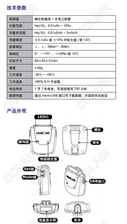 • 累計(jì)計(jì)量檢測(cè)范圍為0.01μSv 至10Sv