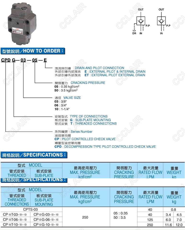 CPG-03-05-E,CPT-10-50-ET,CPDG-03-05-E,CPDT-10-50-ET,引導(dǎo)式止回閥CML
