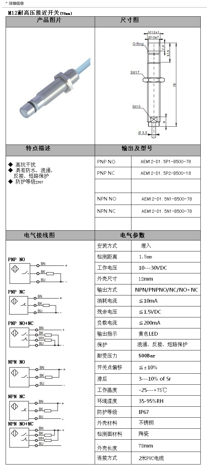 AEM12-D1.5P1-B500-78,AEM12-D1.5N1-B500-78,AEM12-D1.5N1-B500-78,M12引線式(78mm)