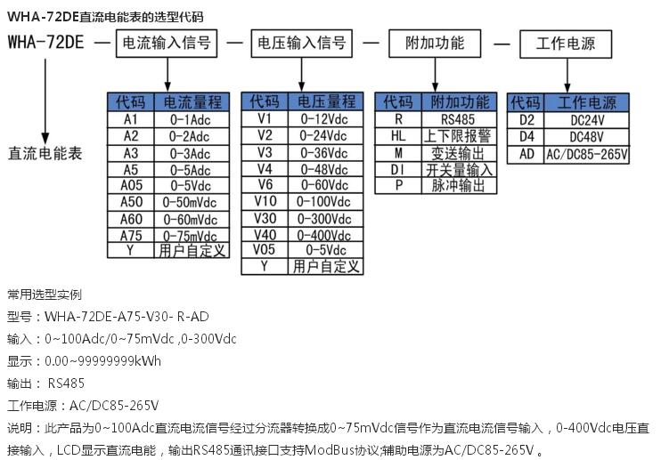 WHA-72DE智能液晶顯示直流電能表專為太陽能光伏發(fā)電系統(tǒng)、移動電信基站、新能源汽車等的電力監(jiān)控而設計,它可以同時測量直流電路上的電流、電壓、電能。它們都配有RS485通信接口,通過標準的Modbus協(xié)議,可與各種組態(tài)系統(tǒng)兼容,從而把前端采集到的直流電參量實時傳送給系統(tǒng)數(shù)據(jù)中心。