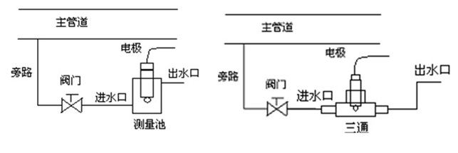 為保證電極在管路上正確測(cè)量出pH值,應(yīng)避免測(cè)量池間出現(xiàn)氣泡而造成數(shù)據(jù)失準(zhǔn),請(qǐng)嚴(yán)格按下圖安裝:, ,
