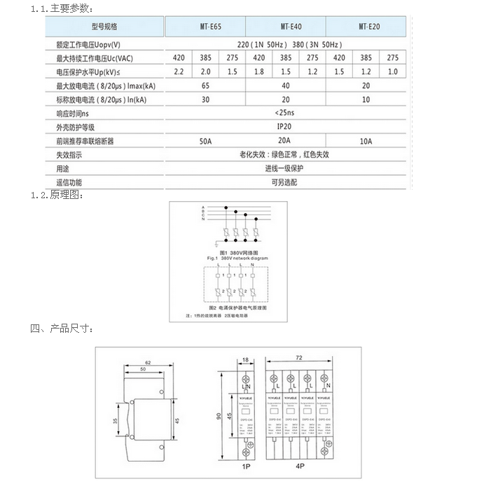 MT-E20電涌保護器(以下簡稱E20)適用于交流50/60Hz,額定電壓380V的IT、TT、TN-C、TN-S、TN-C-S等供電系統(tǒng),對間接雷電和直接雷電影響或其他瞬時過電壓的電涌進行保護。依據(jù)IEC61643-1:1998-02標準。