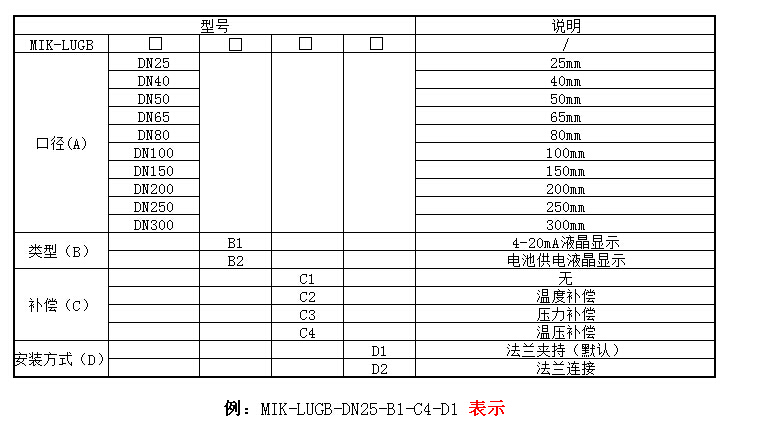 儀表口徑(mm):15、20、25、32、40、50、65、80、100、125、150、200、250、300