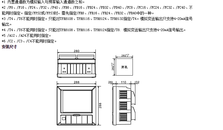 | ●報警輸出繼電器(/A12,/A24): 輸出點(diǎn)數(shù):從12、24點(diǎn)中選擇。 ●通信功能(/C2,/C3) 媒體:RS-232(/C2)或RS-485(/C3) 協(xié)議:Modbus-RTU(從機(jī))協(xié)議 通信速率:1200/2400/4800/9600/19200/38400/57600 ●打印功能(/C4) 打印機(jī):面板式微型打印機(jī)。 打印內(nèi)容:實時數(shù)據(jù)、歷史數(shù)據(jù)、累積報表。 打印方式:手工打印、定時打印。 ●模擬輸出(/T4,/T8) 信號類型:4-20mA 輸出點(diǎn)數(shù):從4,8點(diǎn)中選擇。 輸出方式:測量通道的變送輸出。 最大負(fù)載:750Ω ●24VDC變送器電源輸出(TP8): 輸出點(diǎn)數(shù):8回路。 輸出電壓:24VDC。 額定輸出電流:4~20MADC。 最大輸出電流:65mAdc(過電流保護(hù)動作電流:約90mA) |