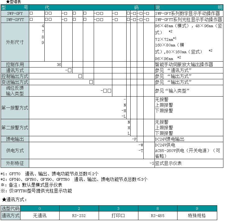 SWP-GFY系列數(shù)字/光柱顯示手動伺服放大輸出操作器,可通過按鍵操作直接輸出正轉(zhuǎn)和反轉(zhuǎn)控制信號,驅(qū)動各種電動調(diào)節(jié)閥門,并帶實際閥位數(shù)字顯示,適合于各種電動調(diào)節(jié)閥門的手動操作與控制使用。