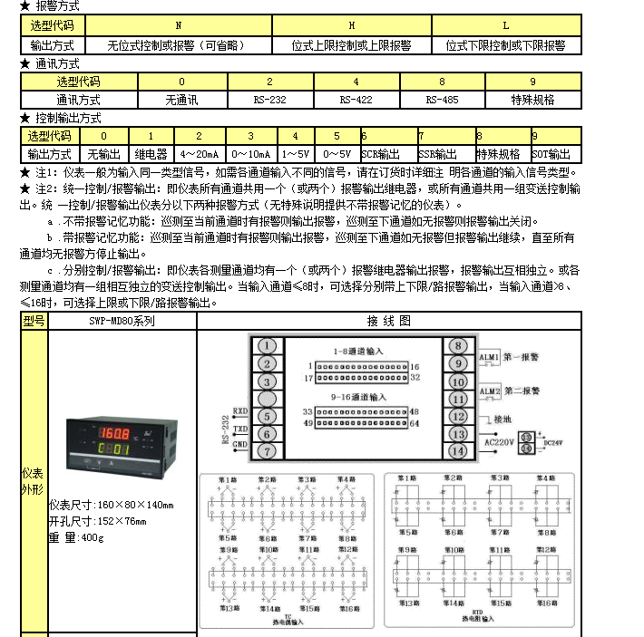 可選擇各輸入通道統(tǒng)一報(bào)警控制輸出(或統(tǒng)一變送輸出)或各輸入通道分別報(bào)警控制輸出(或分別變送輸出)。各通 道統(tǒng)一報(bào)警控制輸出可選擇報(bào)警帶記憶(任一通道報(bào)警未解除將一直報(bào)警直至所有通道均無(wú)報(bào)警)或報(bào)警無(wú)記憶(巡回至有報(bào)警通道時(shí)輸出報(bào)警,巡回至無(wú)報(bào)警的通道時(shí)則不報(bào)警)。