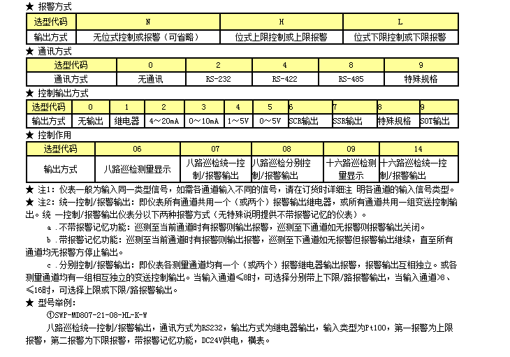 可選擇各輸入通道統(tǒng)一報警控制輸出(或統(tǒng)一變送輸出)或各輸入通道分別報警控制輸出(或分別變送輸出)。各通道統(tǒng)一報警控制輸出并且可選擇報警帶記憶(任一通道報警未解除將一直報警直至所有通道均無報警)或報警無記憶(巡回至有報警通道時輸出報警,巡回至無報警的通道時則不報警)。