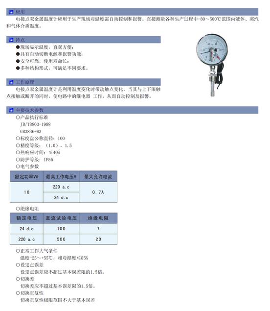 電接點雙金屬溫度計是利用溫度變化時帶動觸點變化,當(dāng)其與上下限觸點接觸或斷開的同時,使電路中的繼電器工作,從而自動控制及報警。