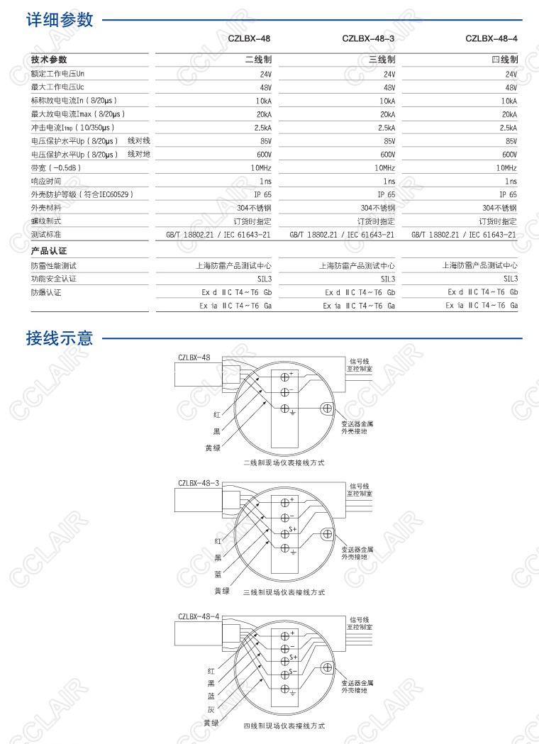 現(xiàn)場(chǎng)安裝型SPD,四線制,螺紋制式(訂貨時(shí)指定):M20×1.5、1/2″NPT、3/4″NPT,適合變送器、熱電阻、熱電偶、RS-485、RS-232、RS-422、流量計(jì)、電磁閥等現(xiàn)場(chǎng)設(shè)備的保護(hù),隔爆、本安防爆雙認(rèn)證。