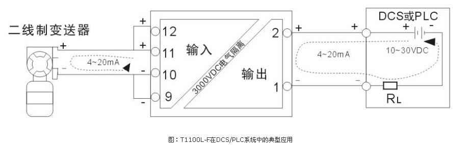 此模塊廣泛應(yīng)用在DCS和PLC系統(tǒng),在系統(tǒng)信號檢測回路中,通過金升陽隔離變送器模塊T1100L-F模塊既能通過對輸出側(cè)取電(即輸出回路供電)供模塊正常工作,無需外接電源,有效地解決對供電電源的依賴,滿足二線制回路供電的要求,又能有效地濾除信號中的干擾噪聲,實現(xiàn)系統(tǒng)狀態(tài)精準檢測,保證系統(tǒng)可靠穩(wěn)定運行,安裝方便,可節(jié)省大量電纜和安裝維護成本,具體典型應(yīng)用方案如下圖所示: