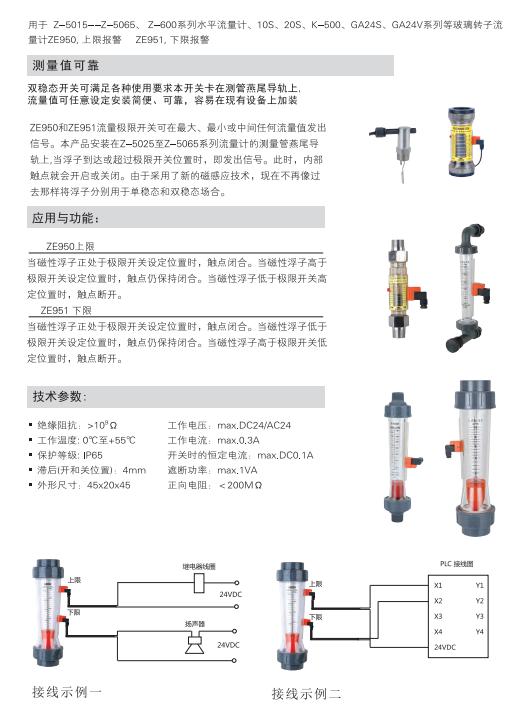 ZE950和ZE951流量極限開關可在最大、最小或中間任何流量值發(fā)出信號。本產品安裝在Z-5025至Z-5065系列流量計的測量管燕尾導軌 上,當浮子到達或超過極限開關位置時,即發(fā)出信號。此時,內部觸 點就會開啟或關閉。由于采用了新的磁感應技術,現(xiàn)在不再像過去 那樣將浮子分別用于單穩(wěn)態(tài)和雙穩(wěn)態(tài)場合。