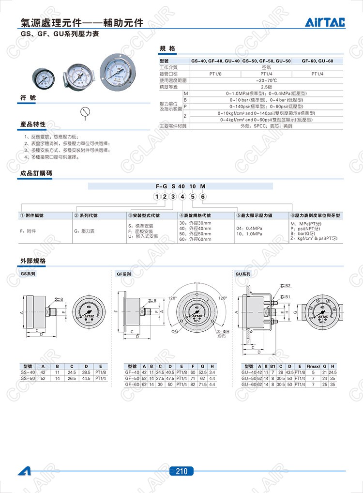 F-GS-40,F-GF-40,F-GU-40,F-GS-50,F-GF-50,F-GU-50,F-GF-60,F-GU-60,AIRTAC壓力表
