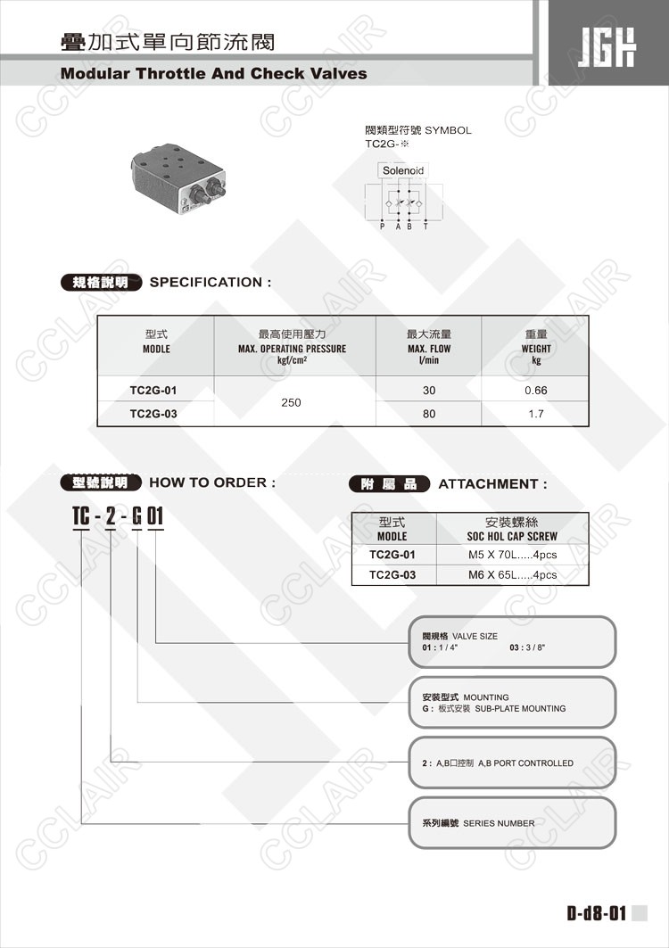 JeouGang臺(tái)灣久岡,疊加式單向節(jié)流閥TC-2-G-01,TC-2-G-03